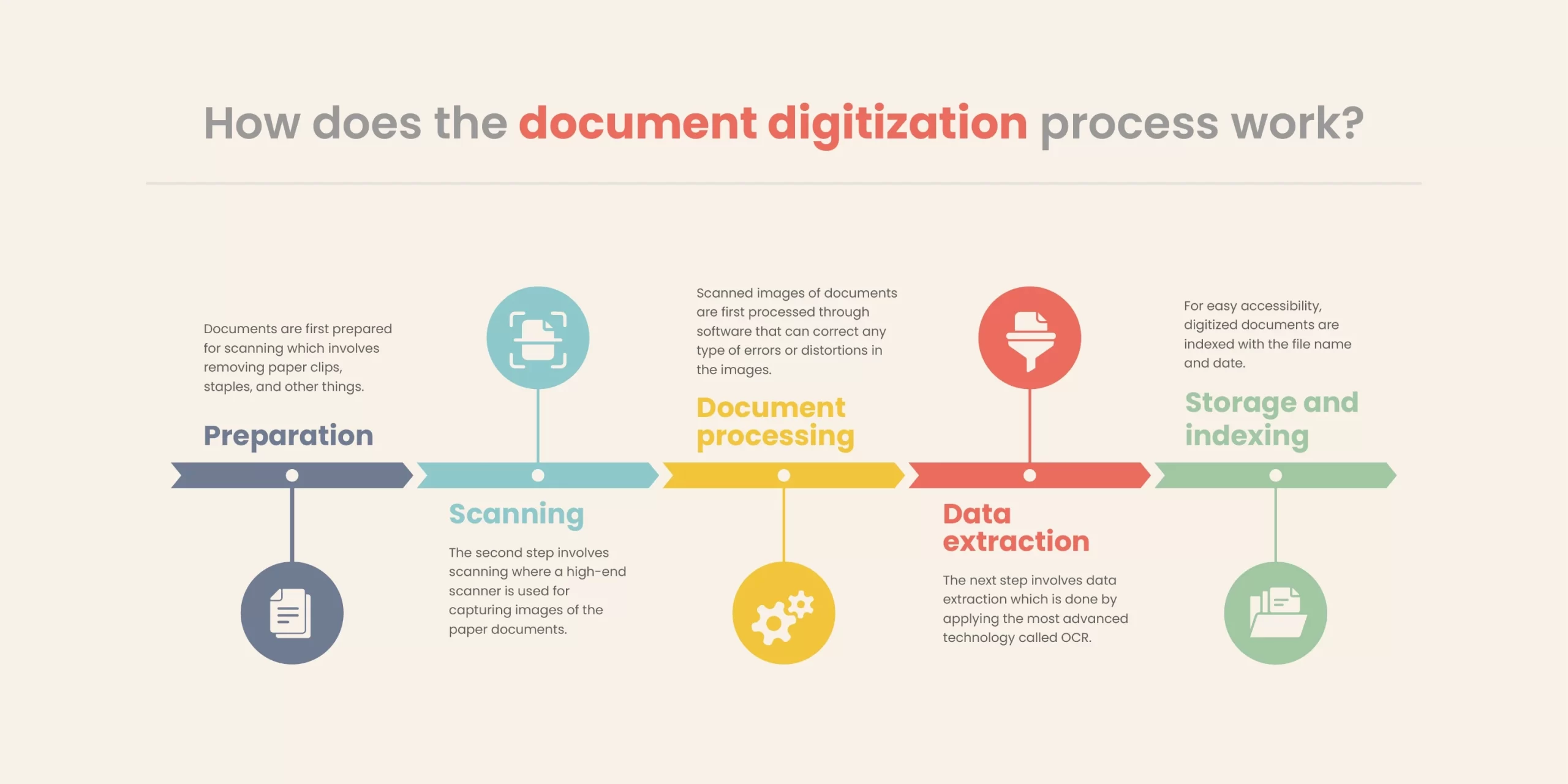 Document Scanning is the process of converting paper documents into digital records. Here, the digitization is done using a scanner that captures the digital image of the documents and OCR technology helps in transforming these digital data into machine-readable language. Once a document is digitized, it is stored in a secure cloud platform for quick accessibility and easy sharing.