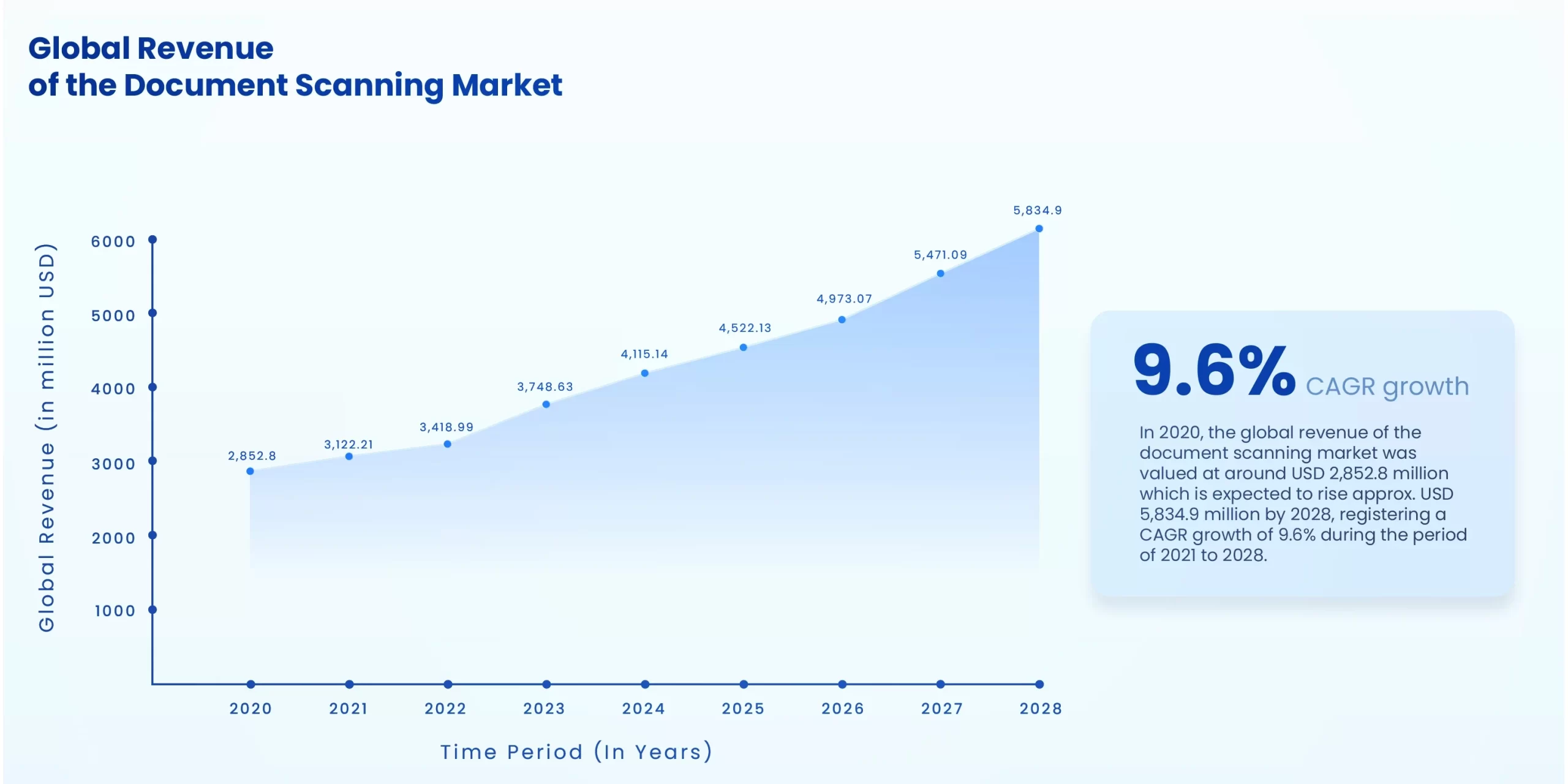 In 2020, the global revenue of the document scanning market was valued at around USD 2,852.8 million which is expected to rise approx. USD 5,834.9 million by 2028, registering a CAGR growth of 9.6% during the period of 2021 to 2028.