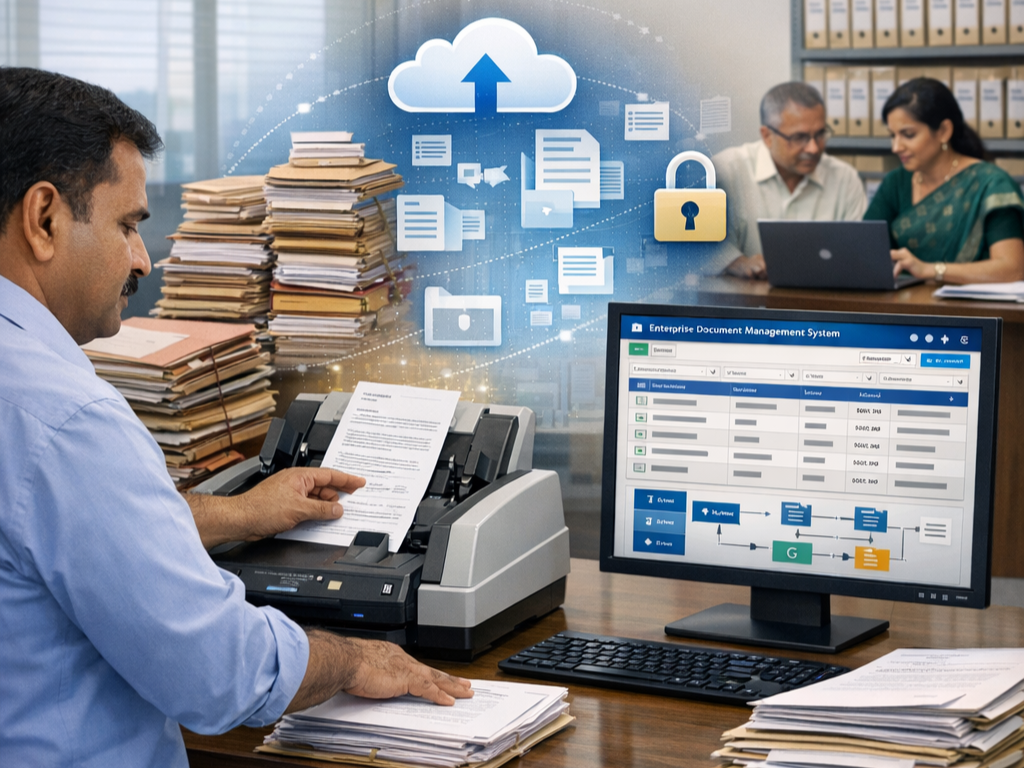 An enterprise document management system helps government organizations in India convert paper records into secure digital files, improve retrieval speed, ensure compliance, and automate administrative workflows. It supports structured digital records management, secure access control, and better coordination across departments.