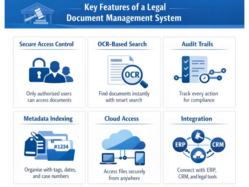 A legal document system should include secure storage, access control, OCR search, audit logs, and integration with existing workflows.